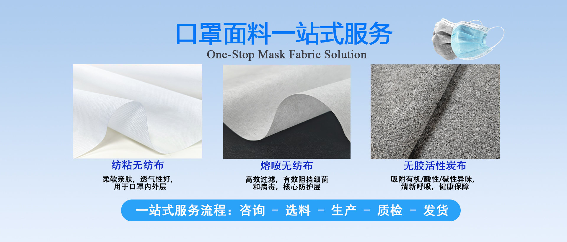 擁有10萬(wàn)級(jí)凈化車間,500平方米研究生實(shí)驗(yàn)室,紡粘無(wú)紡布和水駐極熔噴布生產(chǎn)線;年產(chǎn)布料10000噸